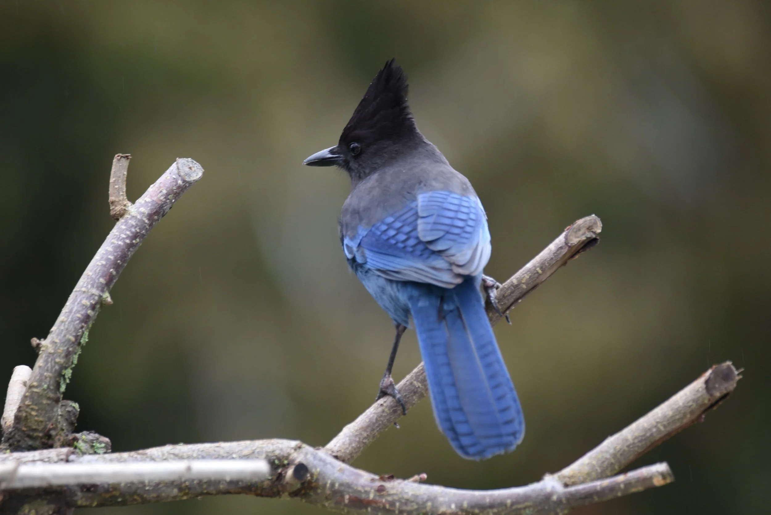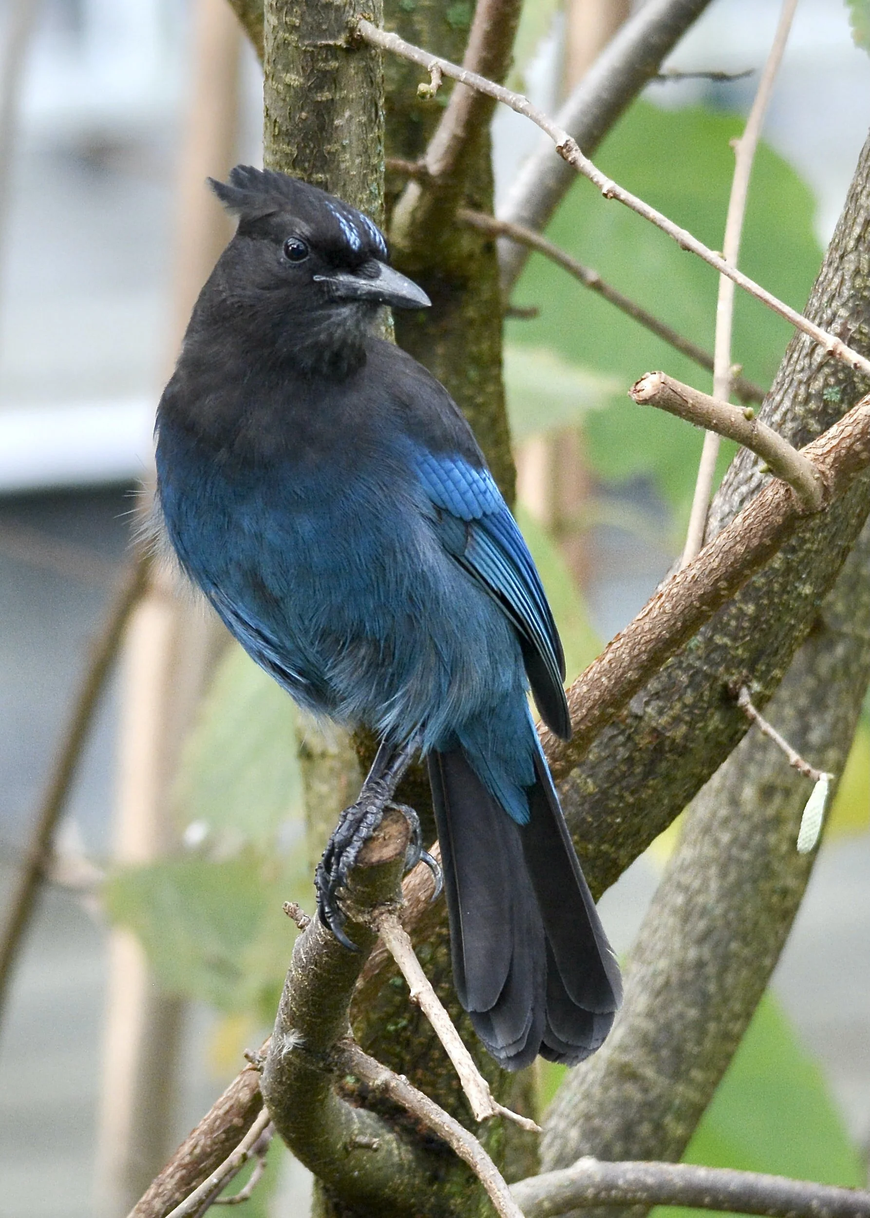 The Stellar's Jay (Cyanocitta stelleri) is a striking bird species native to the forests of western North America. It is easily recognizable by its prominent crest, blue plumage, and black head. Measuring approximately 11-12 inches in length (about the size of an American Robin), the Stellar's Jay is the only crested jay found in the Pacific Northwest.